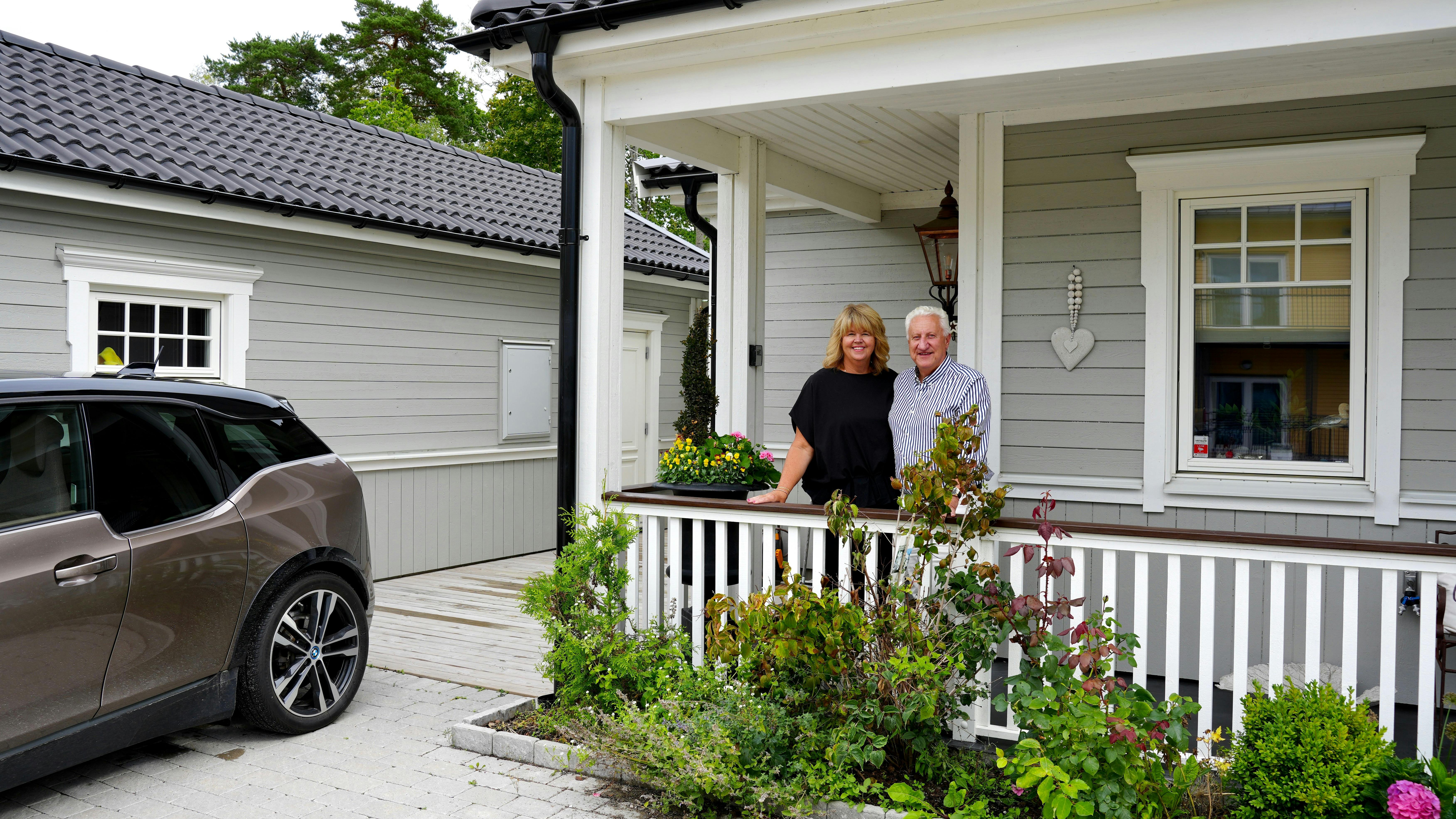 På uppfarten står en elbil som Marie skaffade i september 2022. Genom Tibbers funktion Smartladdning laddas elbilen automatiskt under de billigaste timmarna på dygnet.